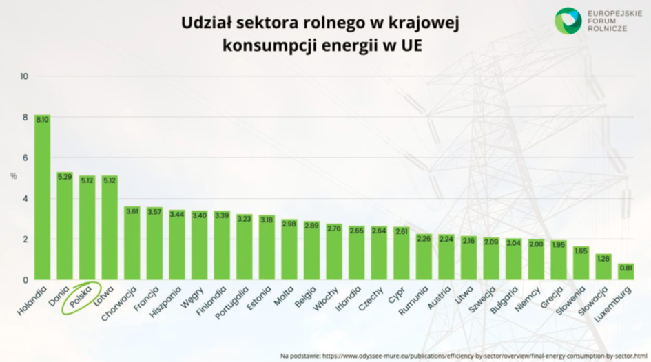 Rolnictwo potrzebuje energii elektrycznej do produkcji żywności, a polskie gospodarstwa potrzebują jej wyjątkowo dużo. Skalę zjawiska dobrze oddają dane strukturalne. W Polsce rolnictwo zużywa około 5,12% całkowitej energii krajowej, czyli wyraźnie więcej niż średnia unijna wynosząca 3,21%2. Oznacza to, że polskie gospodarstwa należą do najbardziej energochłonnych w Europie, co czyni nasz sektor rolny szczególnie wrażliwym na wahania cen energii, jednocześnie dając mu ogromny potencjał transformacyjny.